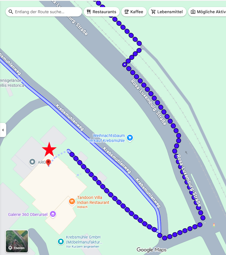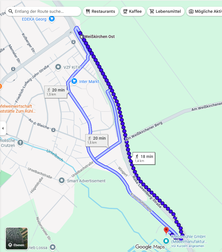 | Übersicht Fußweg von der U3-Haltestelle in Weißkirchen-Ost zur Krebsmühle/Mühleninsel |